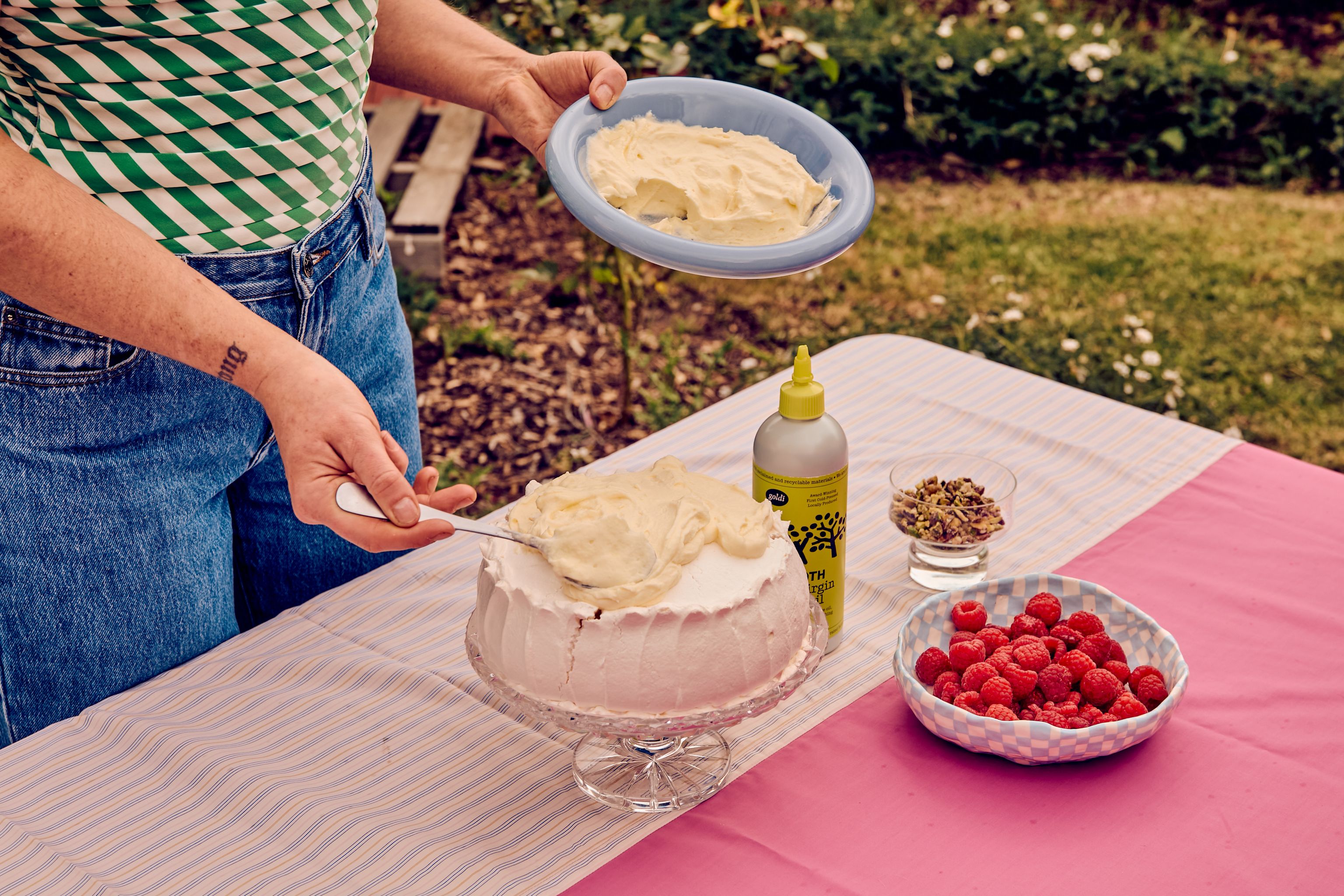 Pavlova with raspberries, salted olive oil cream and candied pistachio